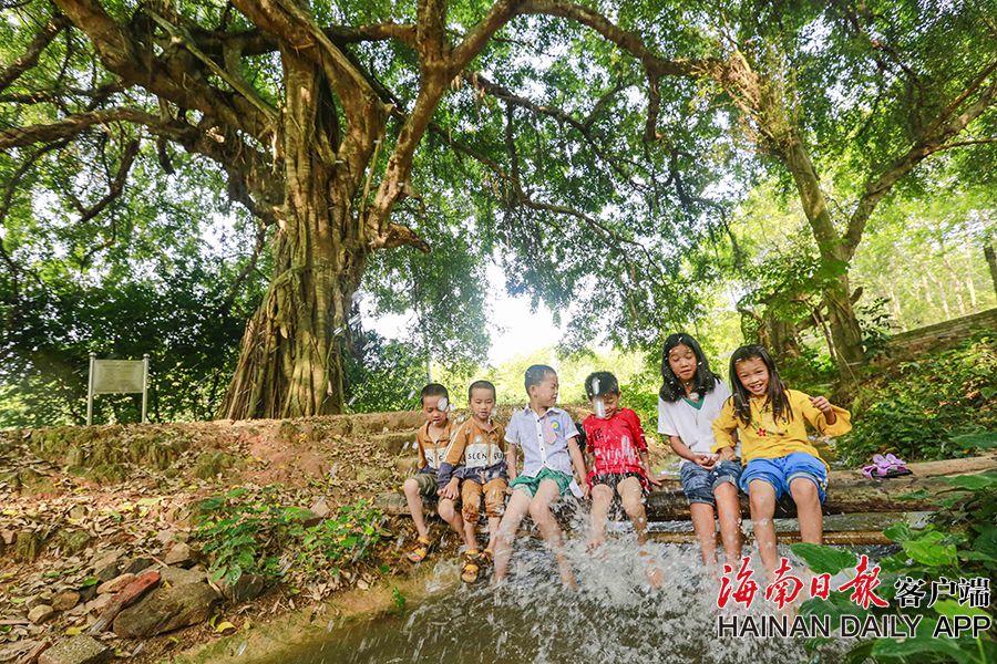 4月11日,在儋州市大成鎮小嶺村委會新坊村,一株300多年的垂葉榕下,孩子們在玩耍。
