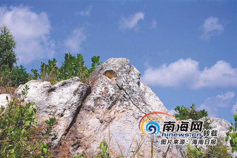在村口,60多歲的王明全老伯知道我們的來意后顯得很高興,主動帶路。穿過幾條野草沒膝的小路,我們來到了一座看起來不是很高的山下。王老伯說:“前面就是白石山了。”透過樹枝空隙,在藍(lán)天白云的襯托之下,山的頂部,幾塊大石在陽光照耀下泛出白色光芒,顯得特別醒目。走上一道小堤壩,沒用幾分鐘,就來到了山頂。站在這座曾經(jīng)名叫“瓊山”的山上,天很藍(lán),似乎伸手就可以摘到幾朵白云。