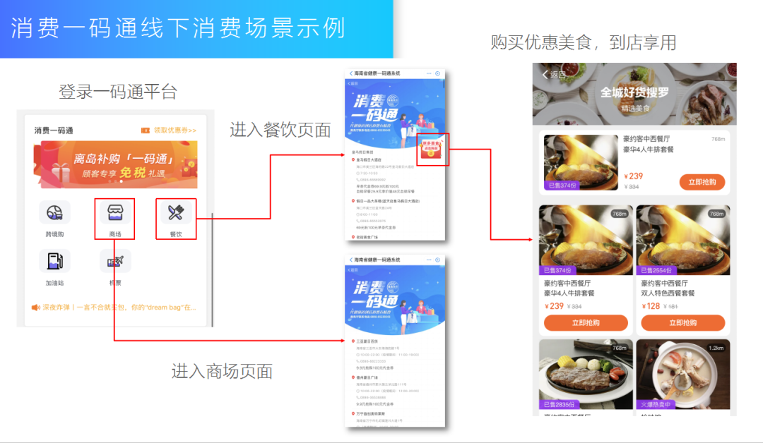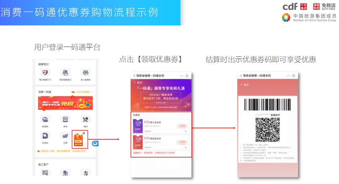 當(dāng)天,中免集團(tuán)、中國(guó)石化、中國(guó)銀聯(lián)、海南航空以及省內(nèi)餐飲、商場(chǎng)、便利店等各類商家將通過(guò)“消費(fèi)一碼通”發(fā)放約3000萬(wàn)元優(yōu)惠券,省內(nèi)外居民在登錄后每人可領(lǐng)取210元消費(fèi)券大禮包,其中包括100元免稅現(xiàn)金券、20元跨境購(gòu)消費(fèi)券、70元中石化消費(fèi)券以及20元航空消費(fèi)券。消費(fèi)券不僅可以在線上購(gòu)物,還可在實(shí)體店付款時(shí)抵扣,滿足廣大消費(fèi)者的購(gòu)物消費(fèi)需求。