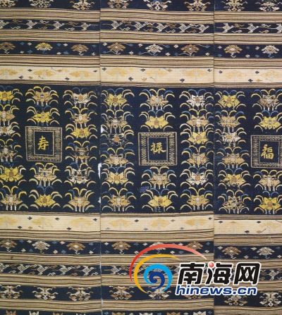 長172厘米,寬100厘米,五幅連綴而成,手工織造,中間一幅寬約17厘米的白色底布,用藍色、褐色、黃色棉線用挑花單面織法織人紋、水波紋、幾何紋、鳥紋、“卍”字紋為主體花紋圖案,以此幅為中線,其余四幅分別兩兩對稱分布在兩側,圖案是分別相對的,花紋使用褐色、藍色線織兩排人紋(亦稱“鬼紋”),間有鳥紋、幾何紋,效果近似于明暗紋。這是黎族傳統的“大被”,主要舉行宗教祭祀或喪事時在中間懸掛,因此它的人紋圖案是分別相對的,是祖先崇拜的表現。這類龍被是黎族哈方言抱懷人所制造和使用的。