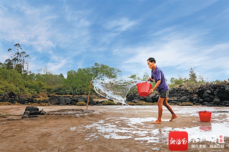 每當大海漲潮時,海水便會浸泡、漫灌鹽田里的鹵土。鹵土大約80%都是火山石粉末,待海水退潮后,便用木耙把鹵土耙松、均勻撒開。海水灌田讓鹵土有了一定的鹽分。隨后,人工潑灑成了制鹽過程中不可或缺的一個環節,將海水潑灑在鹵土上,讓鹽分滲入其中,進一步增加其鹽分含量。