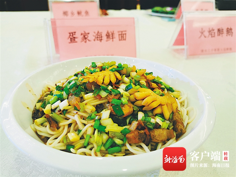 疍家海鮮面以五花肉、蝦仁、墨魚、雞蛋為主要食材,輔以秘制海鮮醬、蝦油,再搭配韭黃、芹菜、韭菜、木耳等,是一款獨具風味的疍家特色面食。