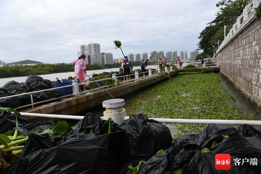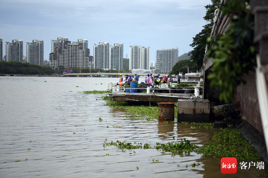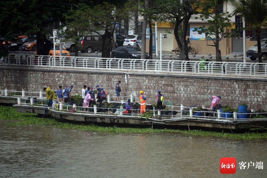 6月17日,工作人員和志愿者在三亞河畔打撈水浮蓮。記者 沙曉峰 攝