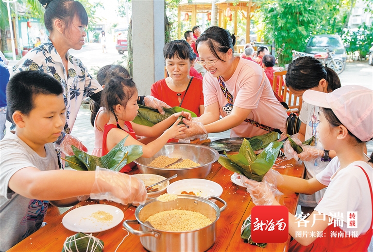 6月25日,文昌東路鎮葫蘆村,家長帶著孩子一起包粽子,通過手工勞動體驗傳統文化。 海南日報記者 袁琛 攝
