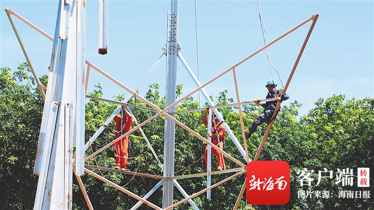 6月26日,在文昌氣電π接220千伏玉洲至江東線路新建工程施工現(xiàn)場,施工人員正在組塔。通訊員 王妍馨 攝
