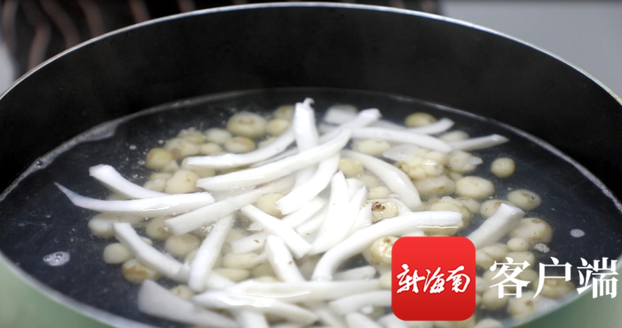 先將椰子肉、馬蹄等配料放至鍋中煮,待水沸騰后,再將文昌雞倒入其中。記者 吳興財 攝