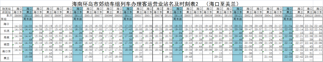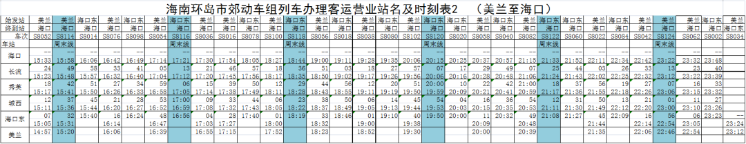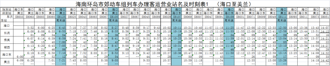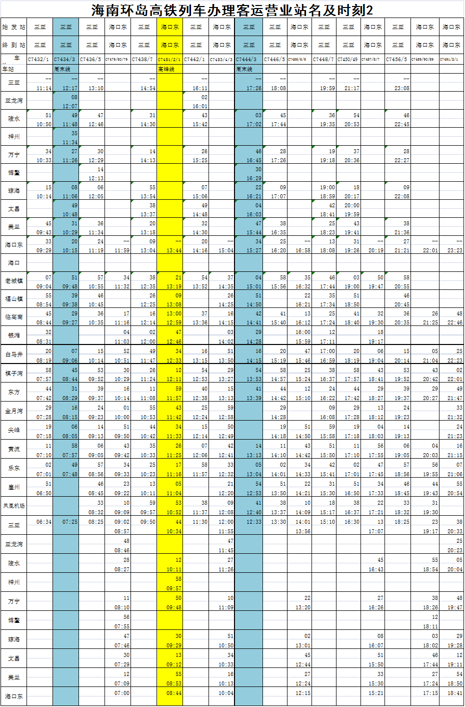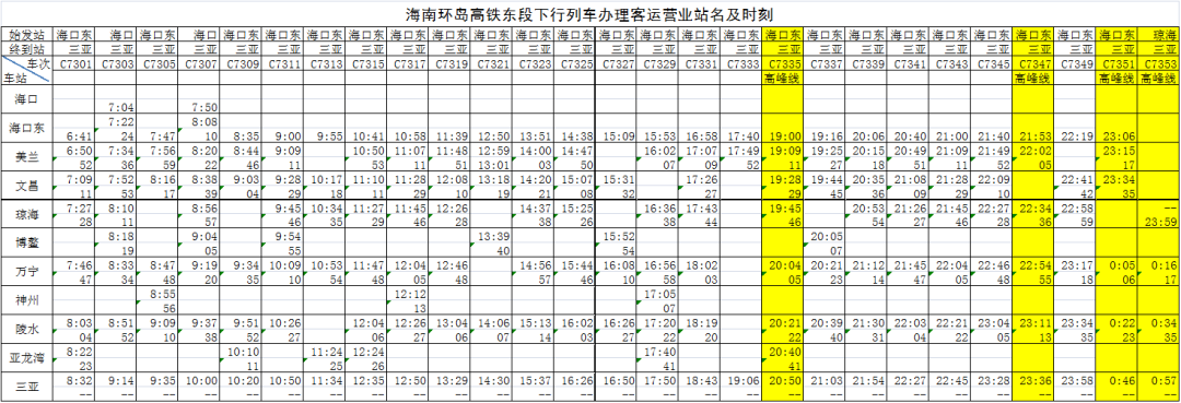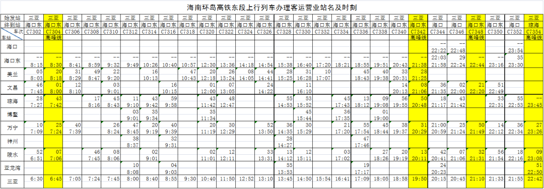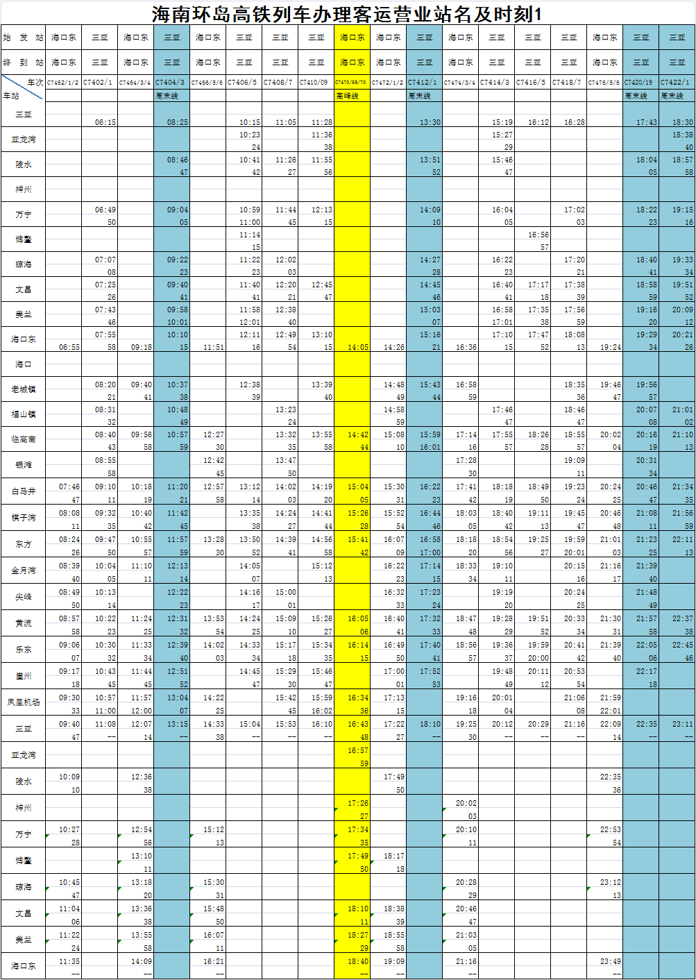 據了解,海南環島高鐵新列車運行圖開行“C”字頭動車組列車47.5對,其中東段本線27對,西段本線3對,三亞至三亞環島10.5對,海口東至海口東環島7對,較舊圖增加2對。新圖仍分為日常圖和周末圖。日常圖開行C字頭動車組列車36.5對,其中海南環島高鐵東段本線23對,三亞至三亞環島列車7.5對,海口東至海口東環島列車6對,較舊圖增加3對;周末圖開行C字頭動車組列車39.5對,其中海南環島高鐵東段本線23對,三亞至三亞環島列車10.5對,海口東至海口東環島列車6對,較舊圖增加3對。海口市郊列車方面部分時刻發生變化,開行對數方面未進行調整。