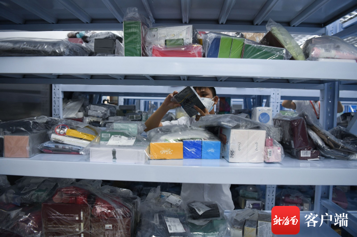 7月10日,三亞鳳凰國際機場新增的免稅提貨點啟用,工作人員在清點免稅商品。記者沙曉峰攝