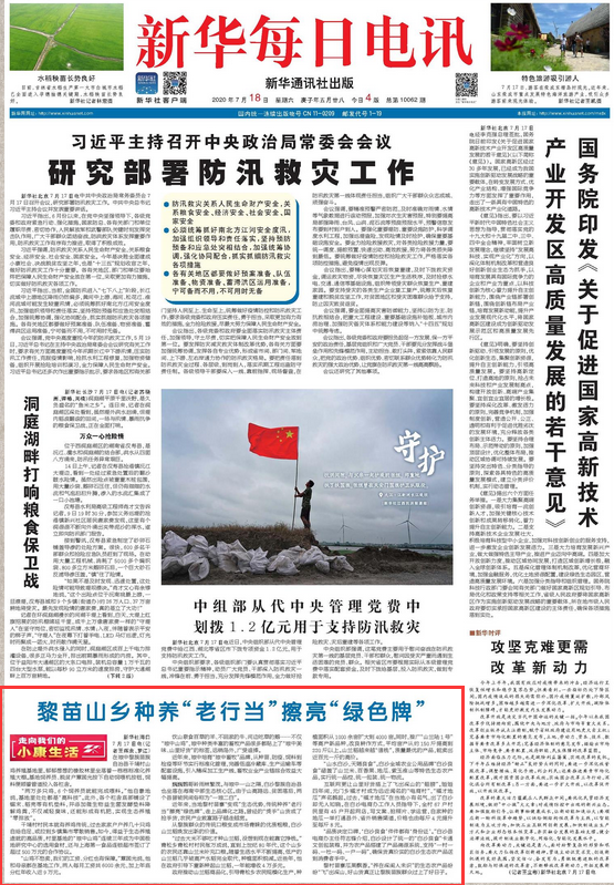 ↑2020年7月17日《新華每日電訊》頭版版面圖