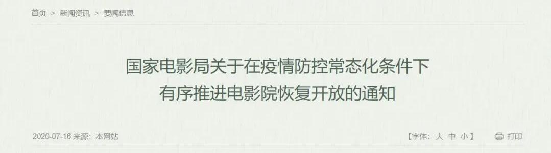 7月16日,國家電影局發布關于在疫情防控常態化條件下有序推進電影院恢復開放的通知?! ?/span>