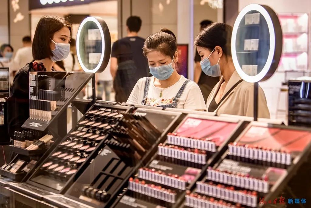 ?兩名女士在海口日月廣場免稅店選購彩妝產品。海口日報記者 陳長宇 攝