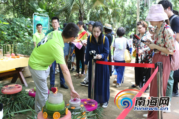 園區(qū)工作人員為記者介紹大熊貓冰蛋糕制作過程及配料。南海網(wǎng)記者孫令正攝