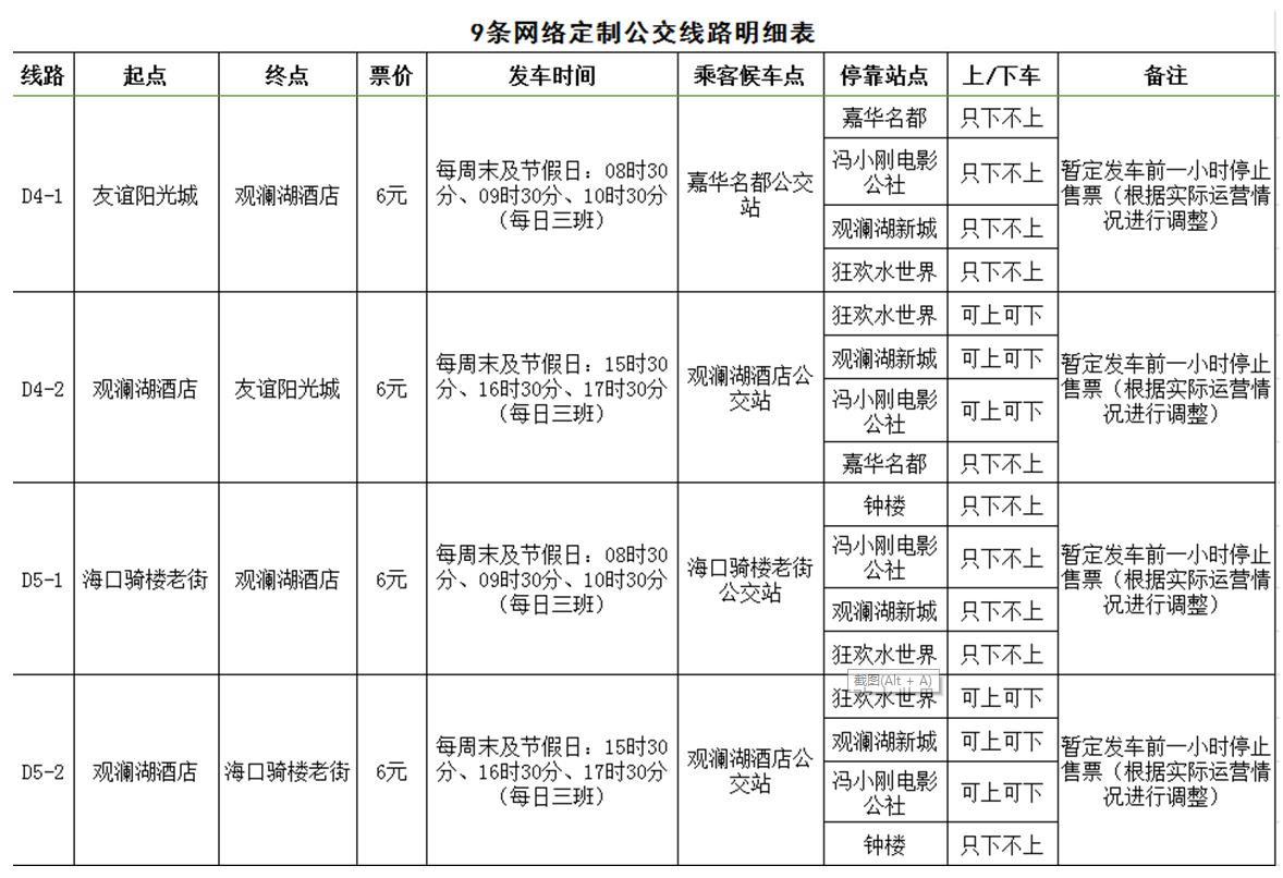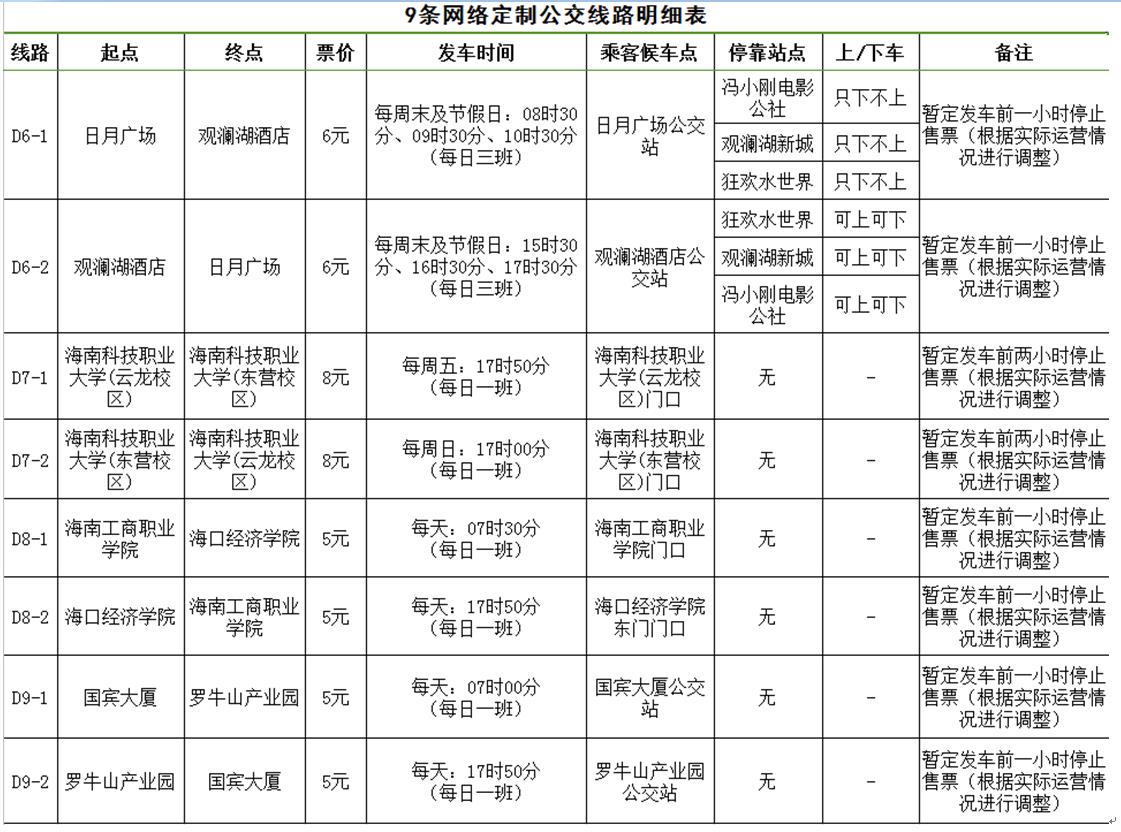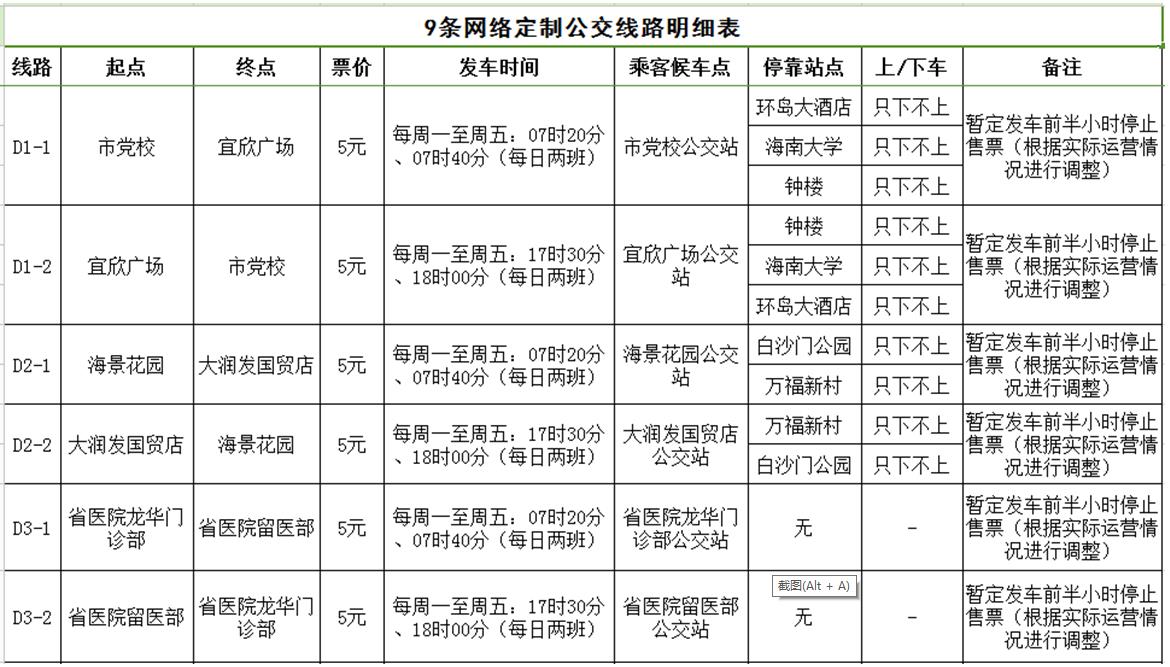 據(jù)了解,海口公交集團(tuán)經(jīng)過充分調(diào)研及需求聚合分析,開通D1(市黨校至宜欣廣場)、D2(海景花園至大潤發(fā)國貿(mào)店)、D3(省醫(yī)院龍華門診部至省醫(yī)院留醫(yī)部)、D4(友誼陽光城至觀瀾湖酒店)等9條網(wǎng)絡(luò)定制公交線路。