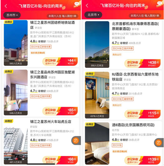旅游百億補貼帶動之下,國內許多城市度假熱持續升溫。以北京為例,西部麗澤商務區、東北部望京商圈、首都機場新國展區域等是企業總部集中區,酒店多以滿足商務出差需求為主。飛豬推出百億補貼以來,不少酒店預訂價格每晚直降400元以上,周末價更低于5折,花經濟連鎖酒店的價格就可以住上四星級或五星級酒店。