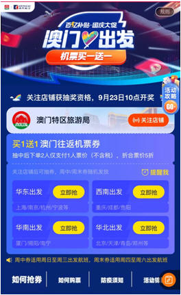9月16日,澳門特區宣布加入飛豬百億補貼活動,澳門機票實行買一送一的優惠折扣?;顒由暇€首日,澳門目的地在飛豬平臺上的相關搜索量增長超過570%。其中,上海人購買去澳門機票占比最高,廣東人預訂澳門各大高星級酒店的人數最多。