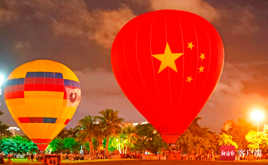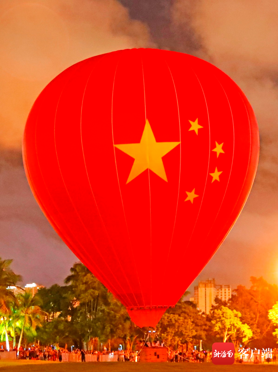 活動現(xiàn)場,熱氣球上五星紅旗的圖樣清晰展現(xiàn),市民游客紛紛拿出手機、相機,記錄這激動人心的一刻。璀璨奪目的多彩夜景,折射出椰城百姓滿滿的幸福。