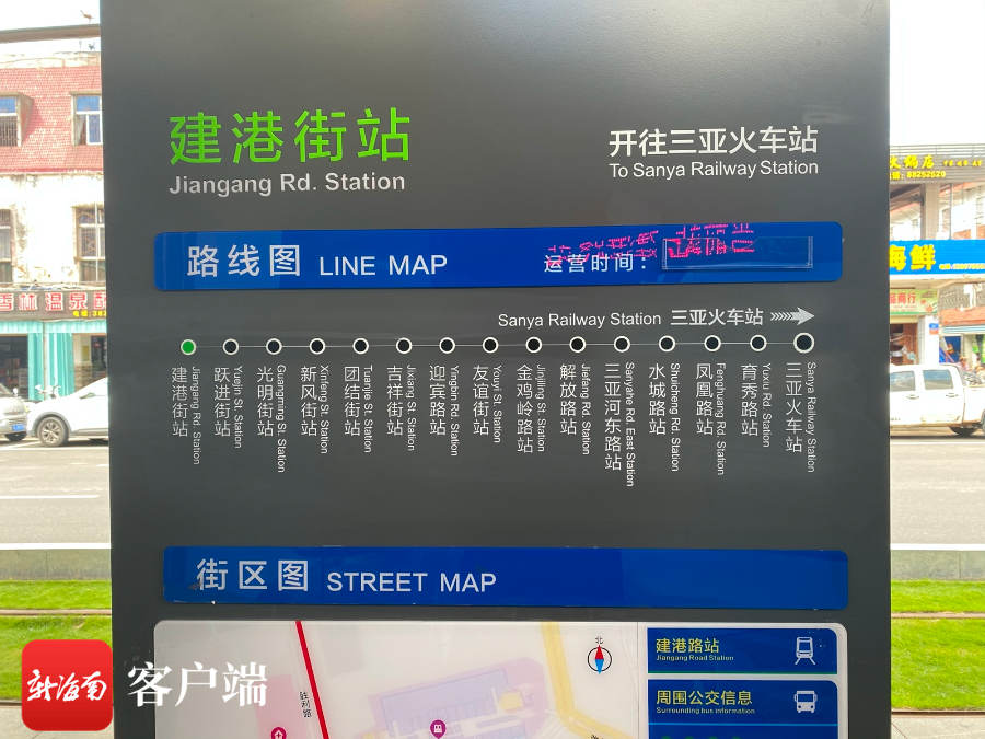 據介紹,三亞有軌電車示范線途經站點有三亞火車站、育秀路站、鳳凰路站、水城路站、三亞河東路站、解放路站、金雞嶺街站、友誼街站、迎賓路站、吉祥街站、團結街站、新風街站、光明街站、躍進街站、建港路站。