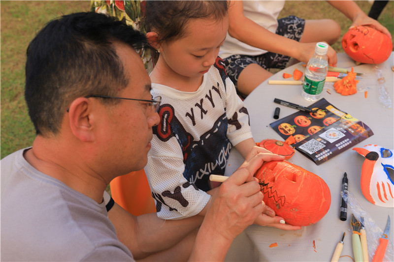 10月31下午,小賓客們前往酒店G層的BBQ草坪,開始對純白色的面具和南瓜進行創作。在家長的陪同和工作人員的指導下小賓客們都發揮了自己天馬行空的想象力,獨一無二的萬圣面具和南瓜燈就此完成。貼心的小賓客還會自己親手制作的面具和南瓜燈送給父母。