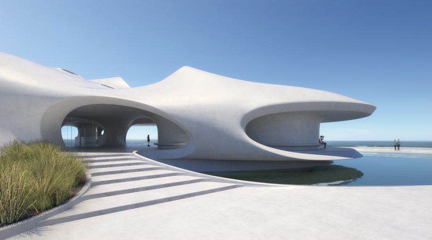 “云洞圖書(shū)館”的建筑靈感其實(shí)是來(lái)源于蟲(chóng)洞,一個(gè)時(shí)空的概念,打造的不僅是蟲(chóng)洞外形,也是類(lèi)似于蟲(chóng)洞的空間,讓人在空間里面有穿越時(shí)空和超越現(xiàn)實(shí)的感覺(jué)。整個(gè)建筑是曲面的、復(fù)雜的造型,大大小小的蟲(chóng)洞就像多維的時(shí)間隧道,整體是非常有趣味而且神秘的空間體驗(yàn)。
