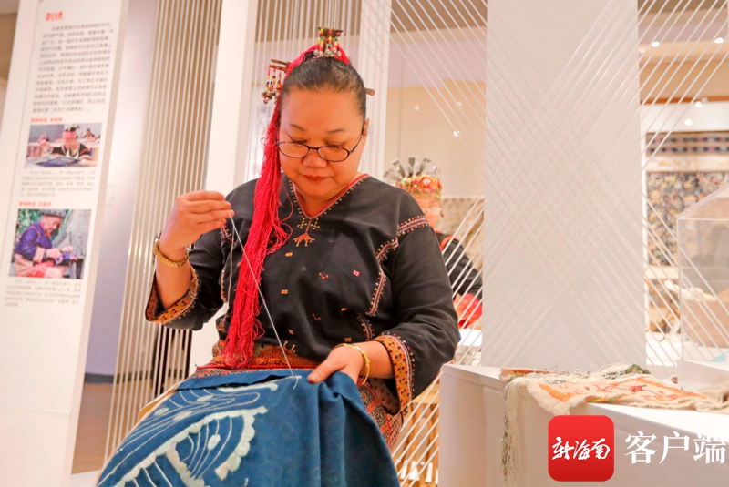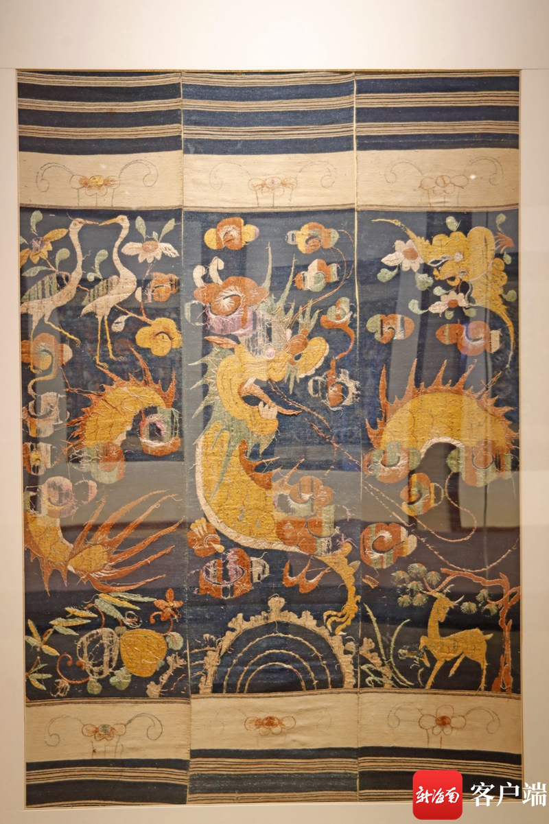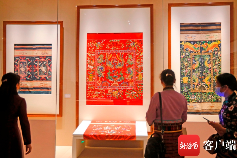 這次展覽共分五大部分:第一部分“淵源”圍繞龍被如何從兩漢“廣幅布”發(fā)展到明清“龍被”;第二部分“形制”圍繞龍被在黎族主要有“大被”和“龍被”兩種分法;第三部分“紋飾”圍繞“大被”以人紋、蟒蛇紋為主體紋樣,“龍被”則以象征皇權的龍鳳紋與吉祥圖案為主;第四部分“工藝”圍繞龍被運用黎族傳統(tǒng)的紡、染、織、繡四大技藝流程;第五部分“傳承”,圍繞近年來龍被技藝的傳承、復制工程的進行,挖掘、傳承、發(fā)展優(yōu)秀的非物質文化遺產,對于海南自貿港建設及其文化發(fā)展意義重大。