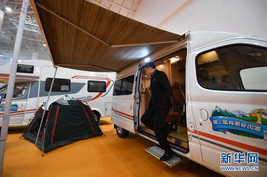 觀眾在參觀展會中展示的一頂露營帳篷。