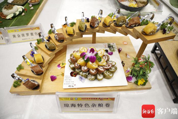 藥浴螞蟻雞、黎家撈寶、瓊海特色雜糧卷……擺在展臺上的特色小吃造型精致,色香味俱全,吸引現場不少游客駐足拍照,這些美食你都吃過嗎?