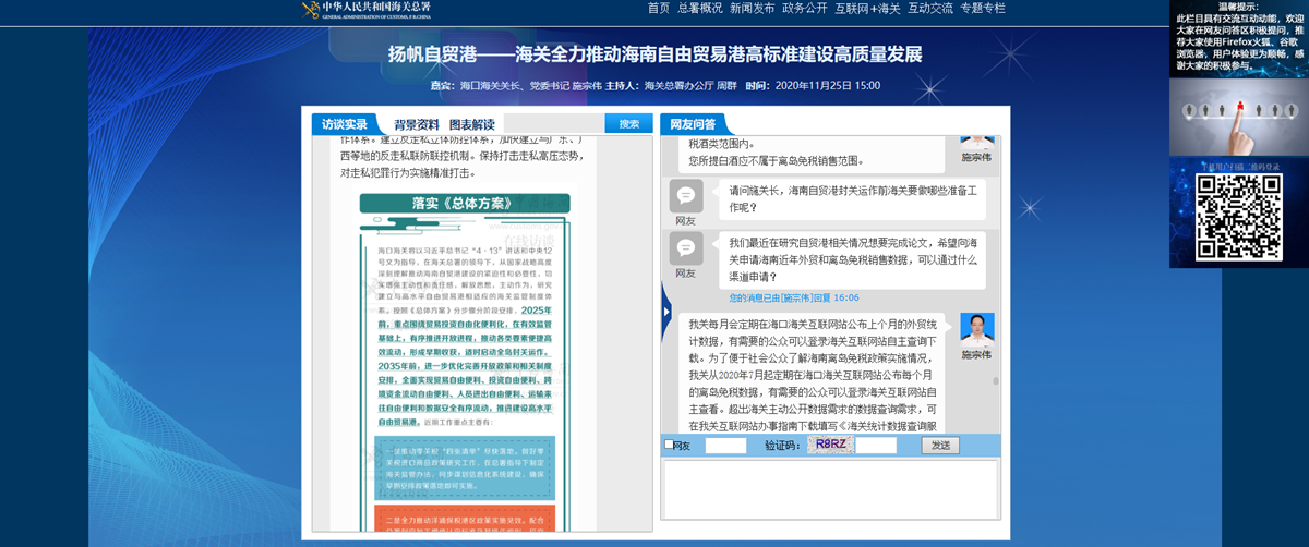 11月25日下午,海關(guān)總署門戶網(wǎng)站通過視頻連線的方式圍繞“揚(yáng)帆自貿(mào)港——海關(guān)全力推動(dòng)海南自由貿(mào)易港高標(biāo)準(zhǔn)建設(shè)高質(zhì)量發(fā)展”這一主題開展在線訪談。(網(wǎng)站截圖)