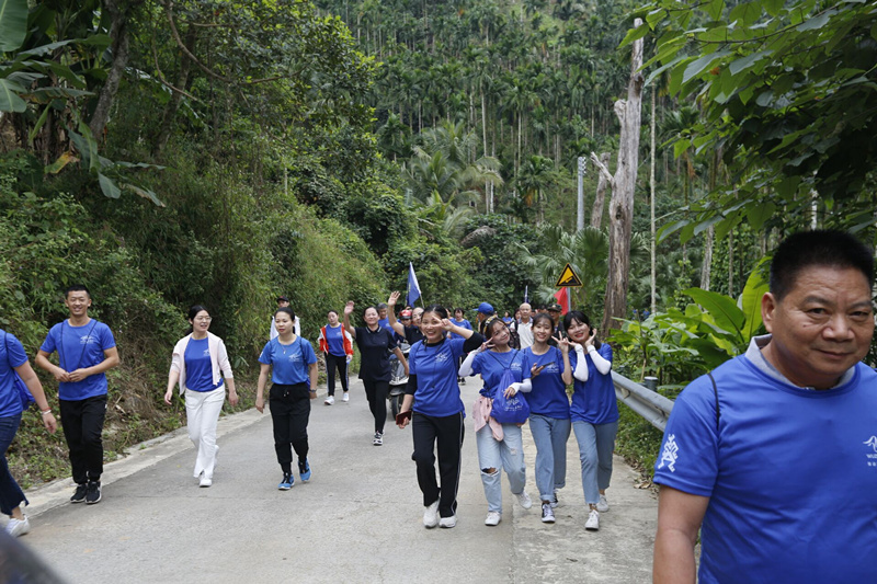 8時30分許,徒步隊伍從五指山市三月三廣場集結出發,途徑三月三大道、泰翡路、太平水庫、太平村、新平村,一路欣賞優美的自然風光,在“天然大氧吧”里享受“醉氧”的酣暢淋漓,感受阿陀嶺的壯美與厚重,最終到達阿陀嶺的朱德亭觀山點,整個徒步路線全程約13.5公里。參與健步的徒步愛好者中,有情侶,也有祖孫三代人,大家互相鼓勁,勇往直前,一起奔向幸福的終點站。