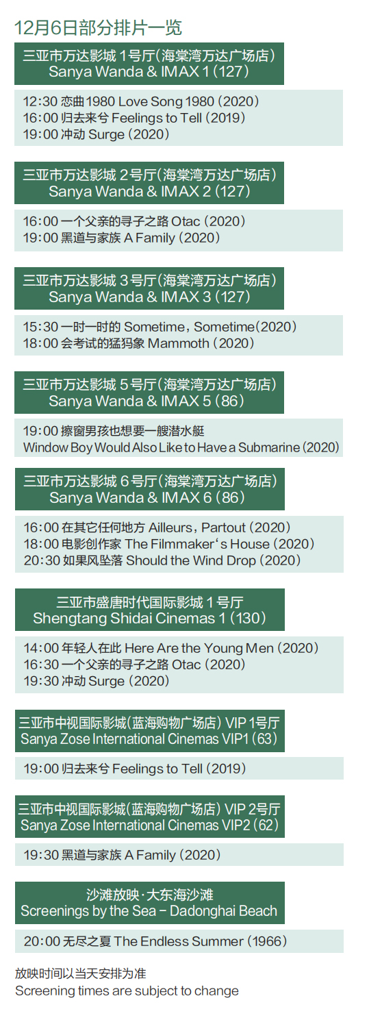 新海南客戶端、南海網、南國都市報12月1日消息(記者 譚琦 孫學新)11月30日,第三屆海南島國際電影節公布展映排片,無論你喜歡的是動作片、文藝片、科幻片、經典老片甚至是默片,在本屆電影節的展映片單上都能得到滿足。第三屆海南島國際電影節將在海南4個城市的15家影院放映8個展映單元豐富多樣的影片,來自60個國家和地區的189部影片將在線下放映,15部海外佳片于電影節期間在歡喜首映平臺進行線上展映,共同開啟觀影盛宴。