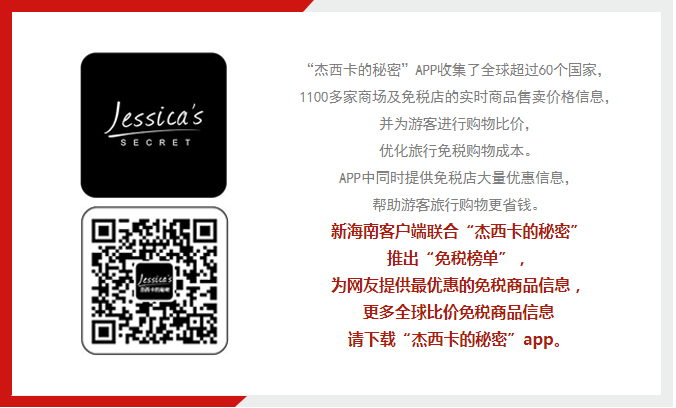 基于全球比價APP“杰西卡的秘密”百萬用戶周期內點擊熱門商品排名,新海南聯合“杰西卡的秘密”推出“最受關注免稅品榜單”,在未來的日子里,將會以“周榜單”和“月榜單”和大家見面~