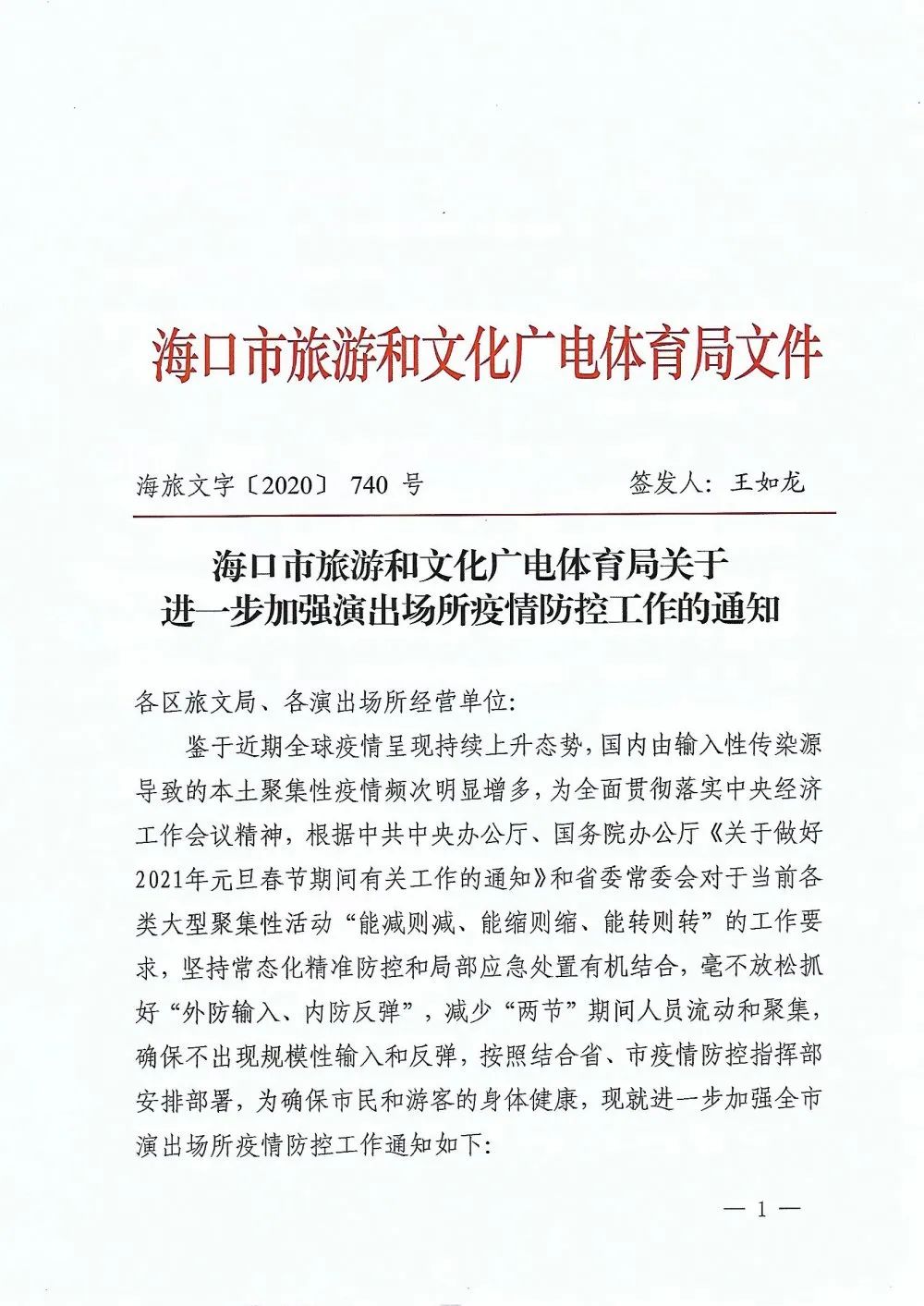 根據(jù)海口市人民政府防疫工作統(tǒng)一要求以及海口市旅游和文化廣電體育局《關(guān)于進(jìn)一步加強(qiáng)演出場(chǎng)所疫情防控工作的通知》文件指示,為更好保障所有觀眾及工作人員生命安全和身體健康,原定于2020年12月31日、2021年1月1日上演的大型民族舞劇《醒·獅》將延期演出,延期的演出我們將為觀眾提供退票服務(wù)。延期上演時(shí)間將另行通知。