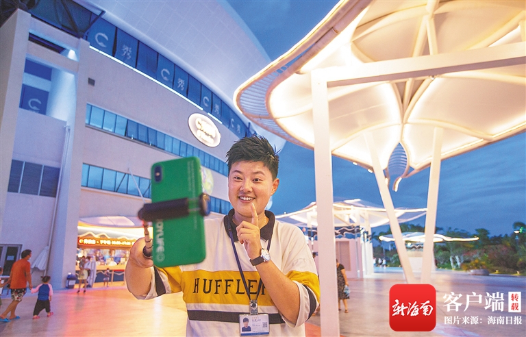 導(dǎo)游沈一笑在三亞·亞特蘭蒂斯直播。 海南日?qǐng)?bào)記者 武威 攝