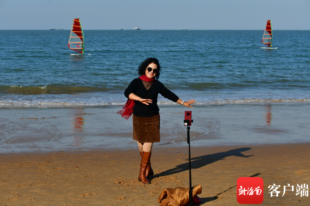 游客在海邊直播海口美景。記者 陳衛(wèi)東 攝