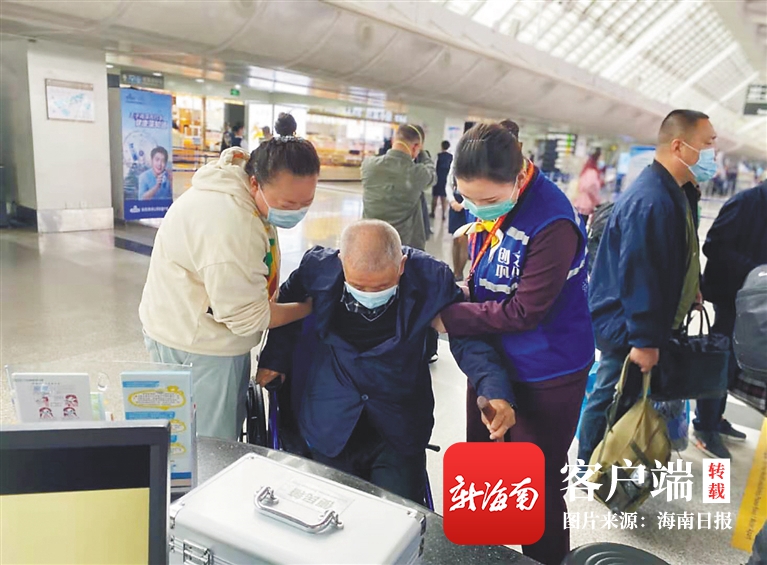 日前,在三亞鳳凰國際機場,機場工作人員正在攙扶行動不便的老年旅客。三亞鳳凰國際機場近期在安檢、掃碼、行李寄存、飲食等方面推出系列出行服務,為廣大旅客提供出行便利。