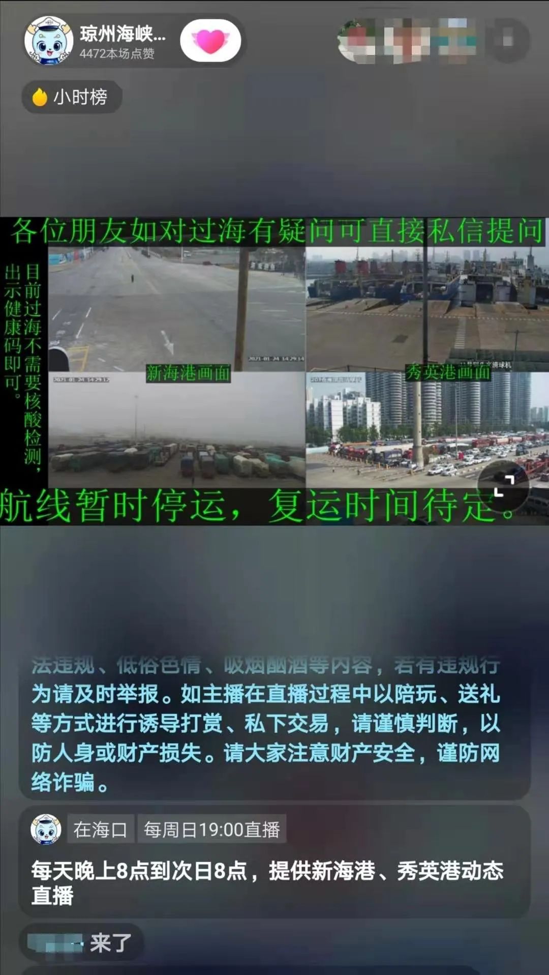 三、通過關注“瓊州海峽輪渡”抖音號,點擊頭像觀看新海港、秀英港車場及道路全天24小時實況直播。