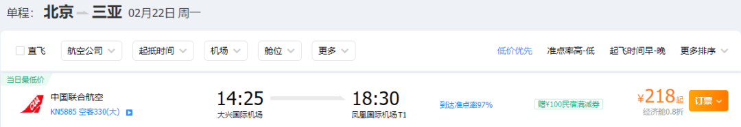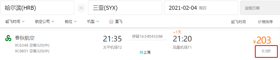 通過網絡訂票平臺可以看出,2月11日—12日,從北京飛往三亞的機票+酒店套餐價格僅430元;從北京飛往上海的機票+酒店套餐價格僅216元。當天,北京飛上海的機票最低180元,還不到高鐵二等座票價的三分之一。記者了解到,2月份,上海、哈爾濱、長春等地飛三亞機票0.5折起,北京、重慶等地飛三亞機票0.8折起。