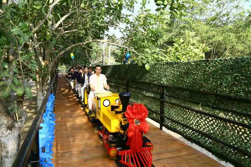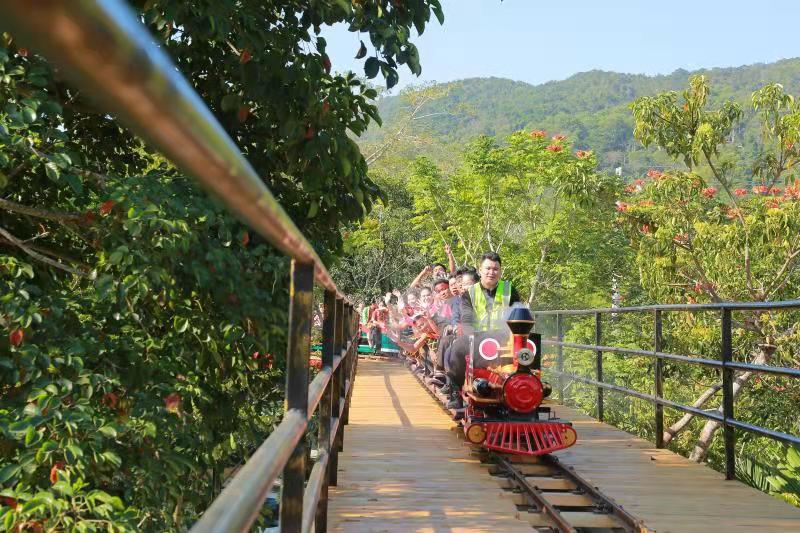 空中小火車體驗區位于檳榔谷景區三月三廣場,項目以雨林文化為核心,全景還原了傳統火車場景,突出“懷舊·童趣”的深度駕乘質感,設有售票大廳、候車站臺、休閑區以及全長600米的有軌車道。滿足親子家庭、研學旅行、同學聚會、單位團建、情侶度假等消費群體的個性化需求。