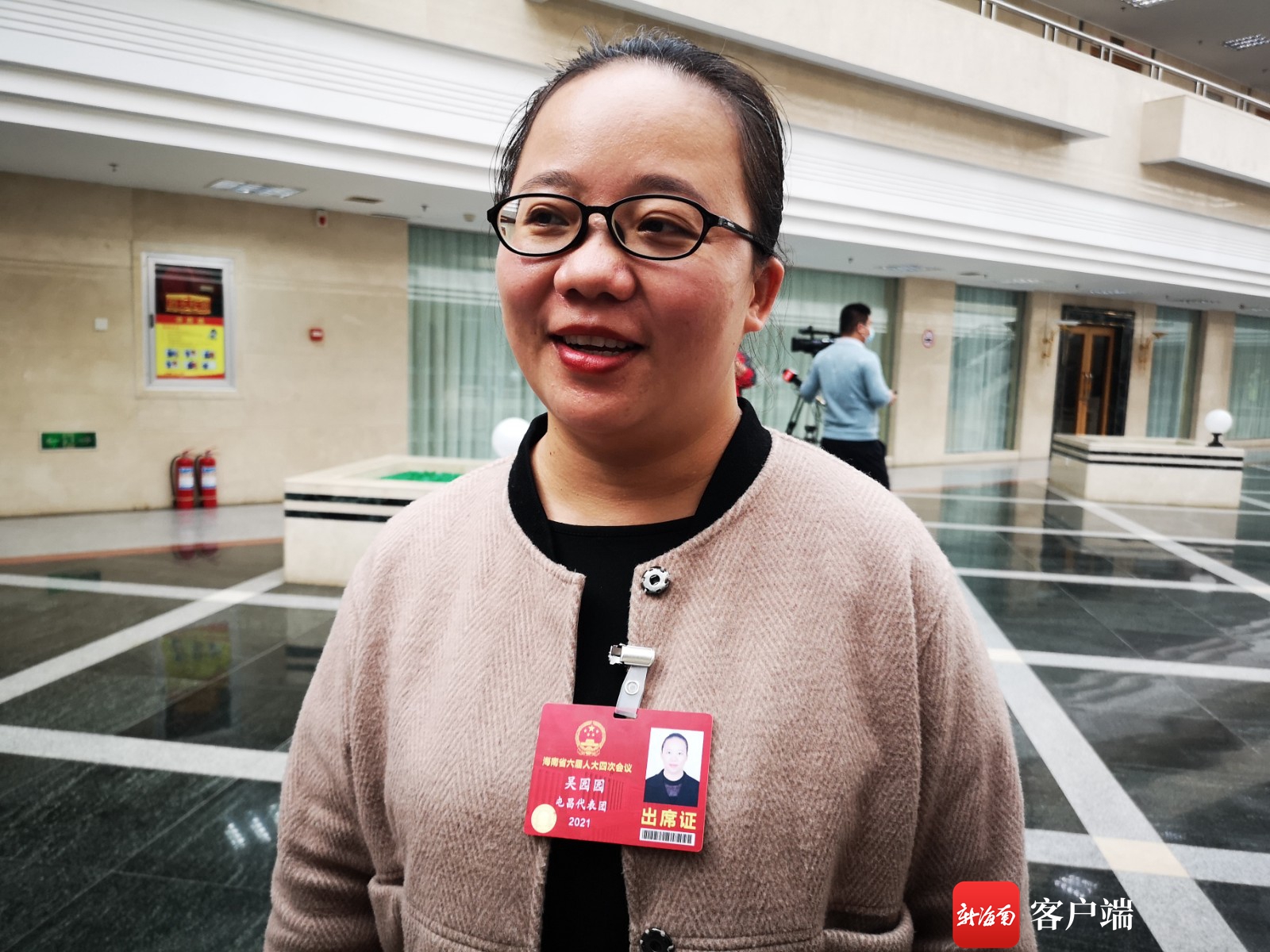 ?海南省人大代表吳園園接受采訪。記者王洪旭攝