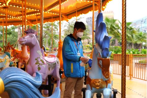 園區內的游樂設施每天至少消毒兩次以上,售票窗口、檢票口服務人員、保潔員、設備操作員等近距離服務游客的一線員工均佩戴口罩,注重個人衛生和有效防護措施。做好工作人員自身健康保障工作,確保游客的出行安全。