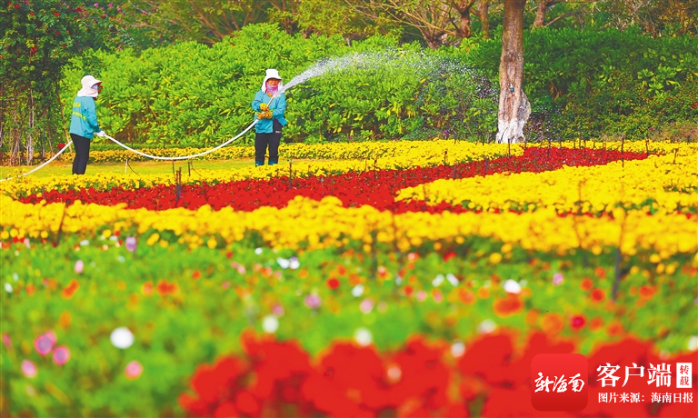 2月3日,為營造喜慶祥和的節(jié)日氛圍,在海口市濱江路,園林工人給鮮花澆水。海南日報記者 張茂 攝