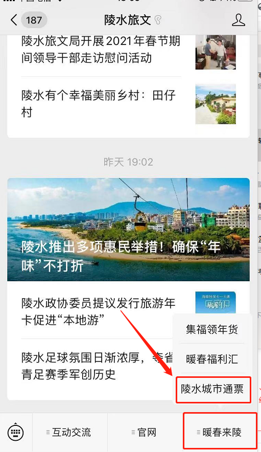 購買陵水城市通票方法:進(jìn)入“陵水旅文”微信公眾號,點擊導(dǎo)航欄右下角“暖春來陵”,點擊“陵水城市通票”,即可進(jìn)行預(yù)訂窗口。