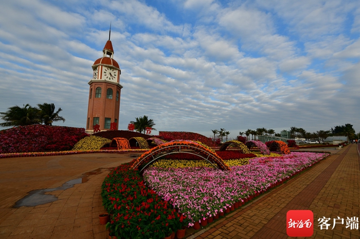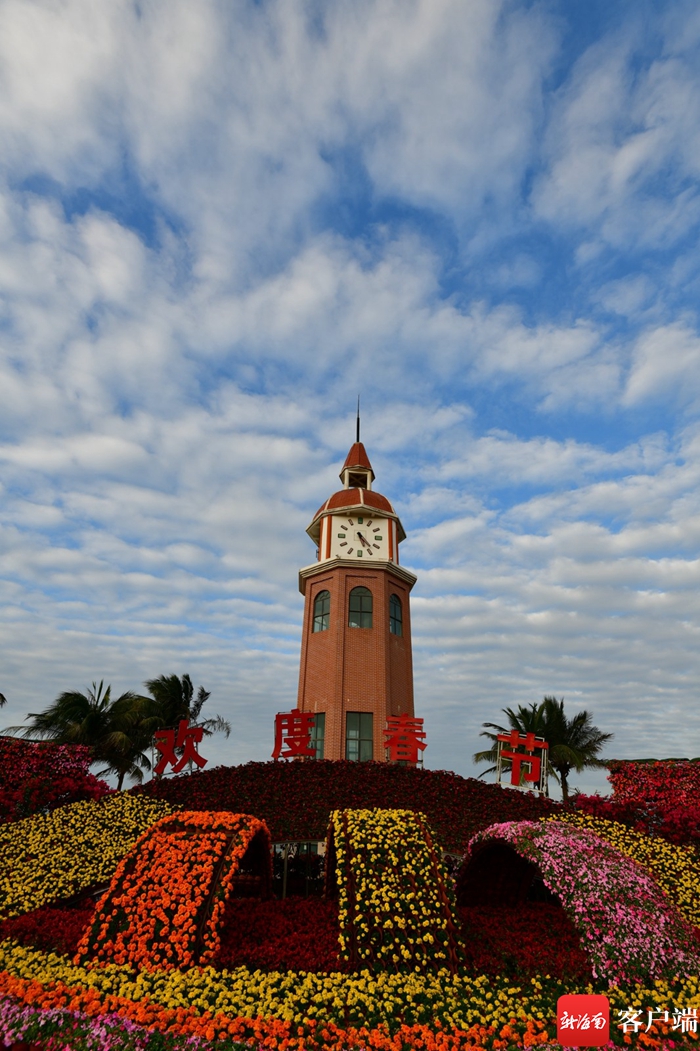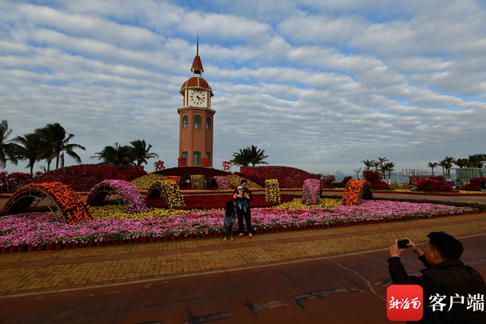 新海南客戶端、南海網、南國都市報2月8日消息(記者 陳衛東)春節前夕,綠化工人將海口西海岸標志性建筑——鐘樓裝扮一新,花叢中的“歡度春節”幾個紅字格外醒目,十余種時令鮮花相輔相成,五彩繽紛。市民游客紛紛駐足欣賞,拍照留念。