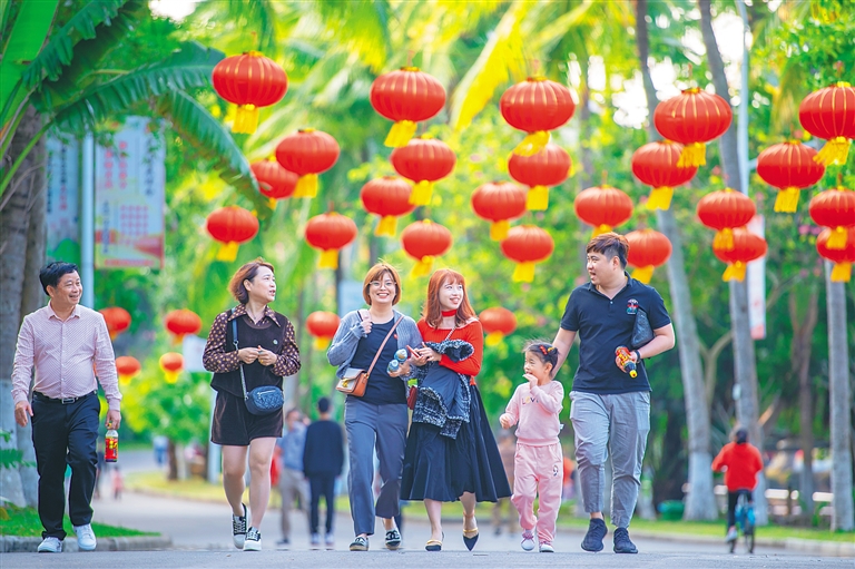 2月12日,在海口市人民公園,大紅燈籠高高掛,吸引了不少市民游客游玩。(海南日報記者 袁琛 攝)