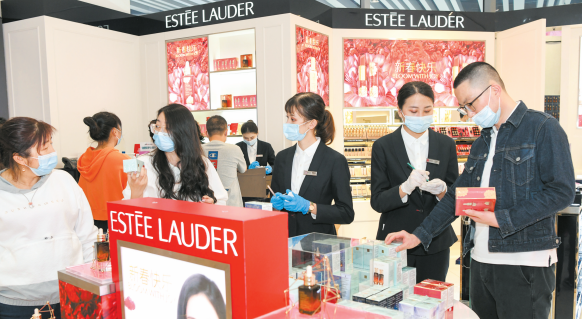 大年初一,在位于??谌赵聫V場摩羯座的??厝蚓罚ê?冢┟舛惓情T前,記者看到,市民游客需佩戴口罩,并出示健康碼,通過自動測溫儀器的檢測,方能進店購物。走進免稅店,在各式紅色中國結的掩映下,到處都洋溢著濃濃的年味兒。