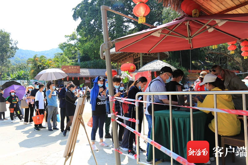海南百花嶺熱帶雨林文化旅游區游客有序排隊。