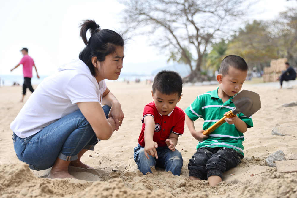 ↑2月21日,游客在海南萬寧石梅灣的沙灘上游玩。