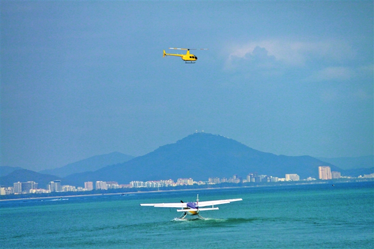 游客在三亞灣體驗飛機觀光。 三亞日報 記者 孫清 攝