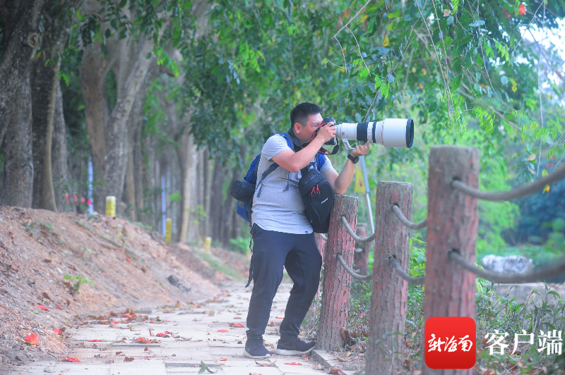 3月23日,三亞學(xué)院白鷺溪畔,一位攝影師在拍攝白鷺。記者 沙曉峰 攝