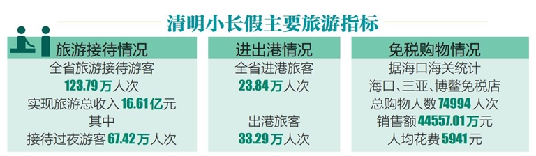 海南日報海口4月5日訊 (記者趙優 通訊員李藝娜)海南日報記者4月5日從省旅文廳獲悉,清明假期期間,全省旅游接待游客123.79萬人次,同比增長160.6%,實現旅游總收入16.61億元,同比增長464.7%。