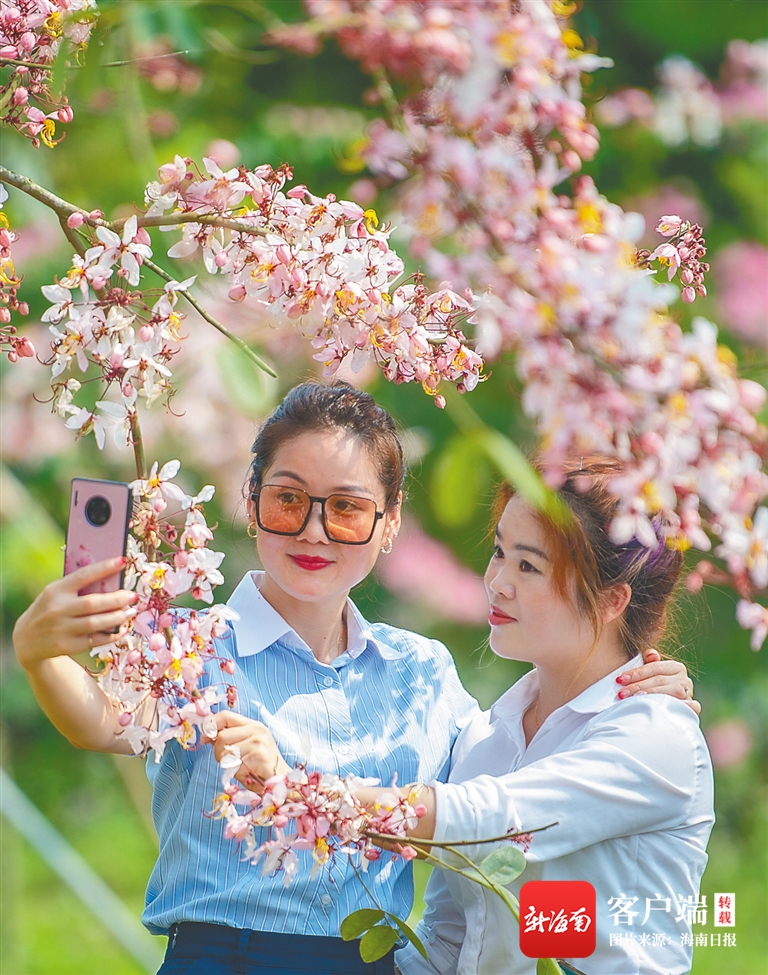 “快看,這里的櫻花開得多旺!快幫我在樹下拍張照?!?4月5日,在儋州市蘭洋鎮的藍洋櫻花樂園,熱帶櫻花競相綻放,粉色的花浪隨風而動,專程從??谇皝淼挠慰屯趵俸团笥雅d奮地拍照“打卡”。